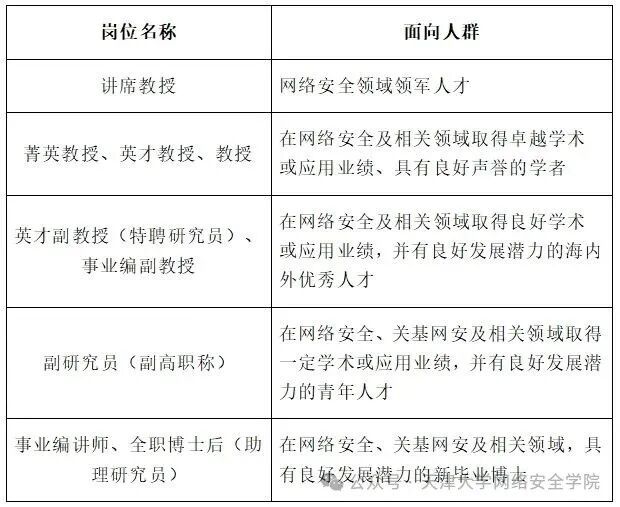 天津大学网络安全学院成立于2017年,2024年获批中央网信办、教育部一流网络安全学院建设示范项目(全国16家),拥有一级学科硕士点、博士点,学院学术氛围浓厚、产学研合作资源丰富、生源充足,诚邀海内外优秀网安人才加盟!欢迎依托天大网安学院申报海优、其他高层次人才计划!