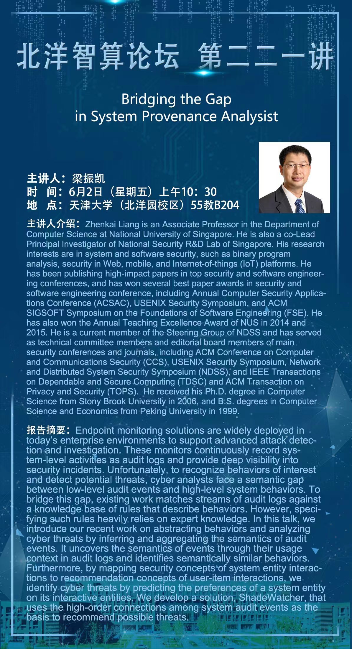 梁振凯是新加坡国立大学计算机科学系副教授,新加坡国家安全研发实验室的联合首席研究员,研究兴趣是系统和软件安全,如二进制程序分析、Web、移动和物联网(IoT)平台中的安全。他在顶级安全和软件工程会议上发表了具有影响力的论文,并在安全和软件工程学会议上获得了多个最佳论文奖,包括年度计算机安全应用会议(ACSAC)、USENIX安全研讨会和ACM SIGSOFT软件工程基础研讨会(FSE)。
